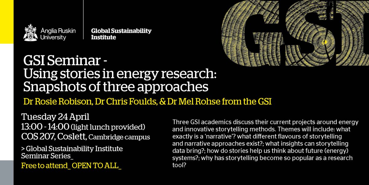 Tomorrow's GSI seminar (as always, open to all) precedes our drop-in (1400-1500) where you can meet staff and current students on our #MSc #Sustainability course.. A @GSI_ARU double whammy! All interested very welcomehttps://twitter.com/drchrisfoulds/status/987049945386635264 …
