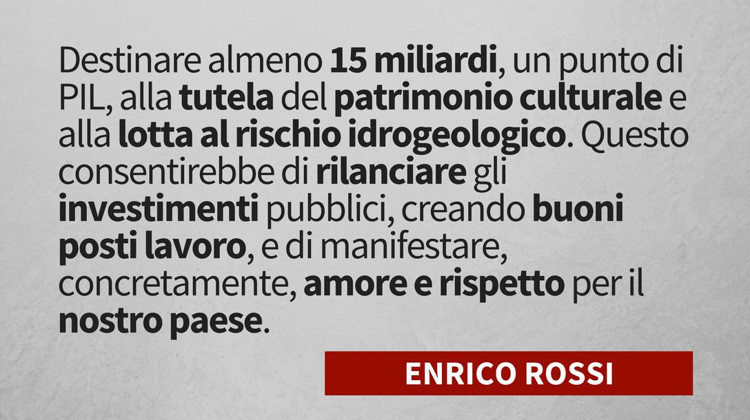 Destinare 15 miliardi alla tutela del patrimonio culturale e alla lotta al rischio idrogeologico. Questo consentirebbe di rilanciare gli investimenti pubblici, creando buoni posti lavoro, e di manifestare amore e rispetto per il nostro paese.