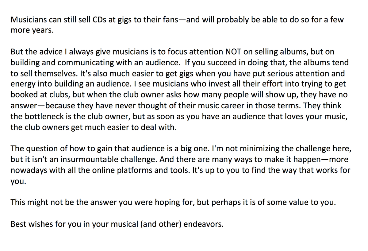 A musician asked my advice on how to sell compact disks. My response probably seems gloomy—or like I'm avoiding the question. But it's what I believe. I share it for what it's worth (probably less than the resale value of a CD).pic.twitter.com/gK6HOfaMTU