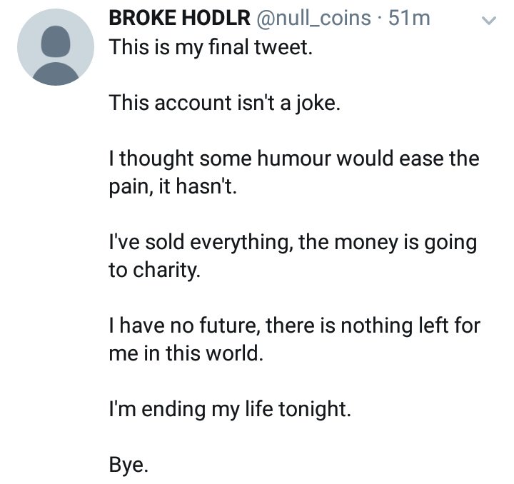 This was the last tweet made by @null_coins before deleting the account. I hope this dude is ok and was just playing his character, I strongly condemn such suicidal jokes, stop making one's. If you know anything about the person who was running this account please let me know.