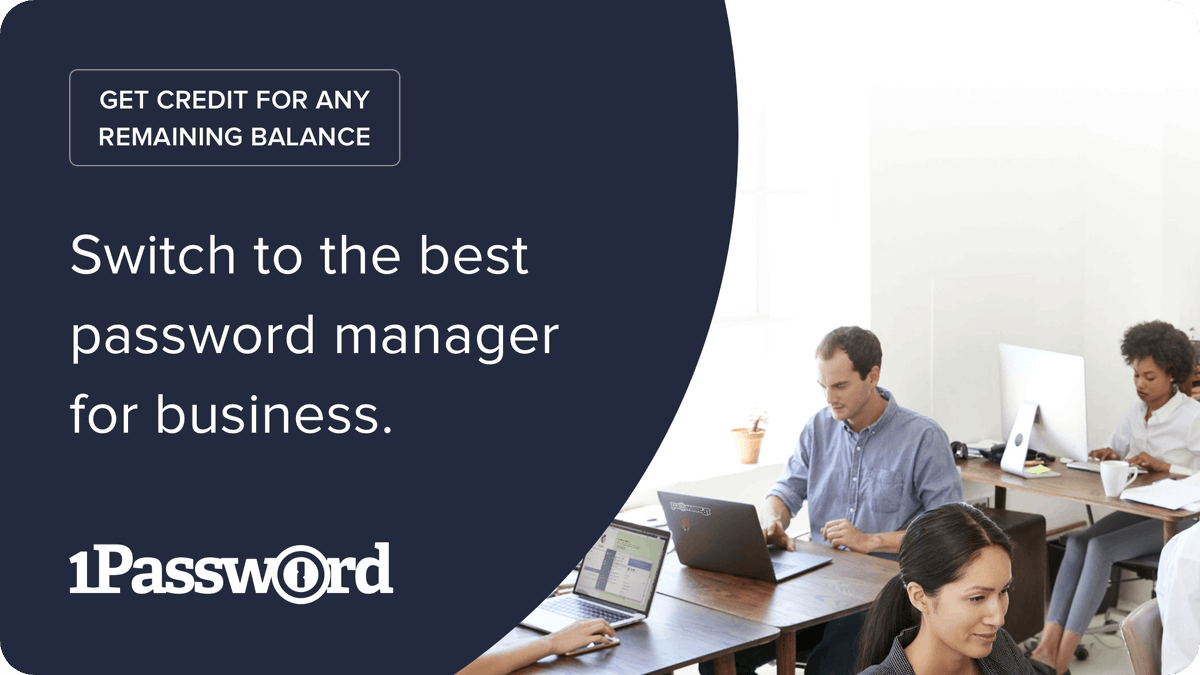 Over 50,000 businesses trust 1Password to secure their sensitive information. Switch from your existing business password manager today, and get 1Password credit to the value of your remaining balance.