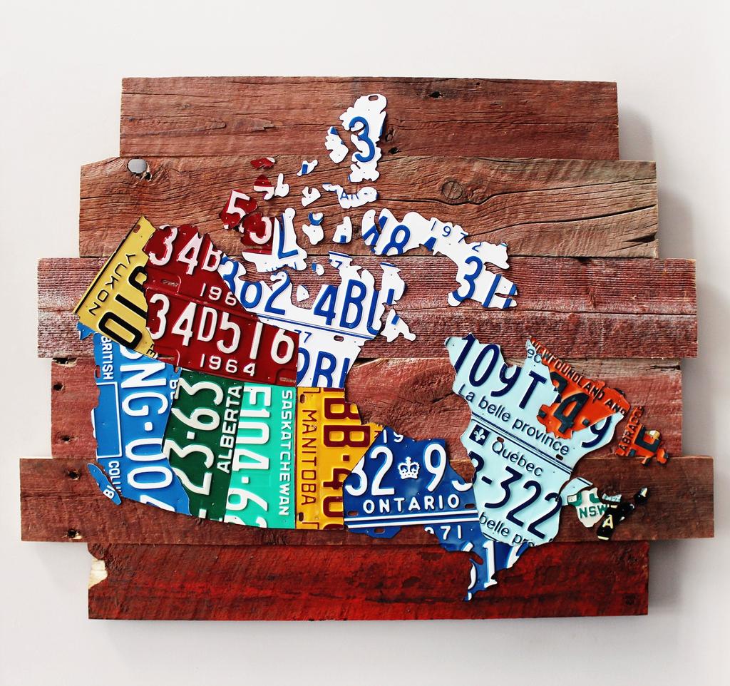 Custom barnboard piece that incorporated the client's old Alberta and Nova Scotia plates