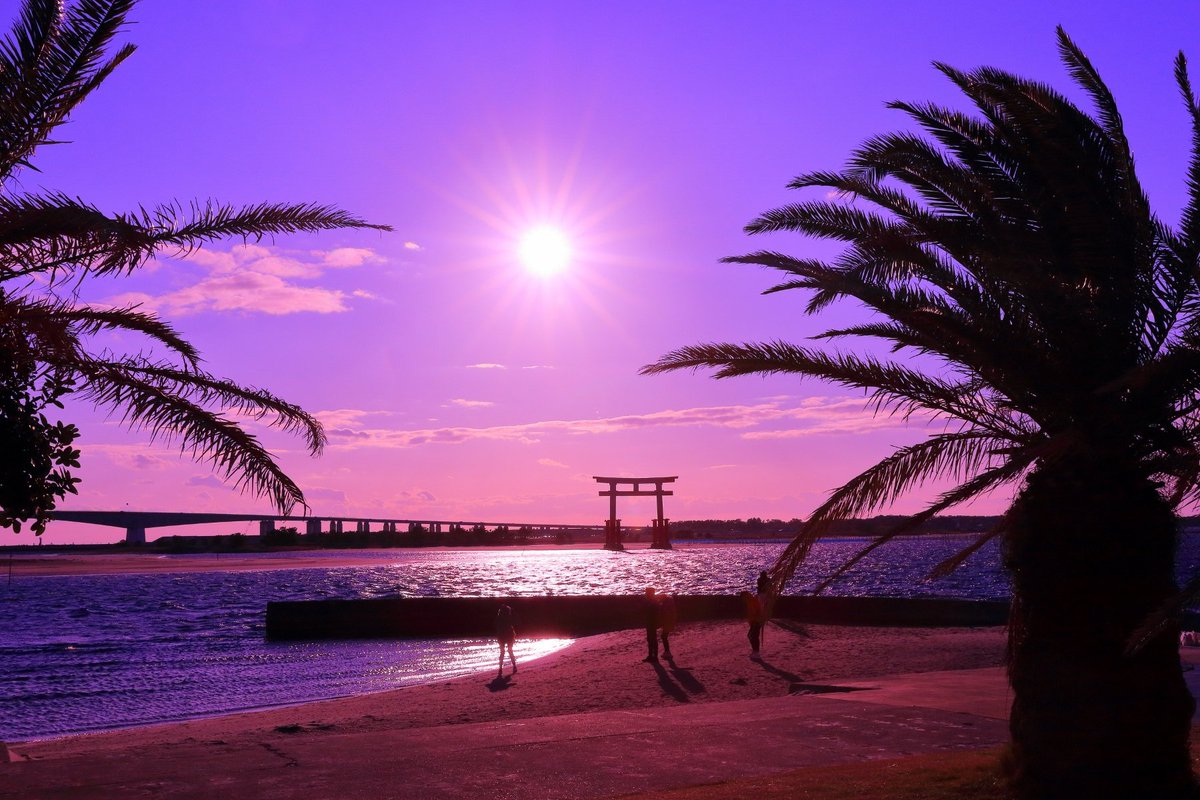 #おはよう日本 2020年元旦に浜名湖弁天島の赤い鳥居の中へ ゆっくりと沈む此の季節期間限定の特別夕陽! 沈む前に雲に横切られて夕陽半欠Σ┗|゚д゚* | ナンデヤネン!! ご利益ある夕陽拝めたのに帰り道車壊れたナンデヤネン