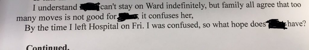 This. Taken directly from a letter from a family member about her sister (with delirium) in hospital. Her sister had been in 7 different wards - not because of diagnostic/clinical need BTW. Heartbreaking. Let’s think about the person, not the bed.
