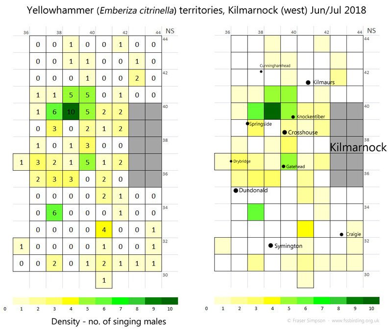 Yellowhammer survey located 112 singing males on the western side of Kilmarnock, Ayrshire. Of 106 square kilometres surveyed, 54 were occupied. In terms of habitat, 22% were found in arable, 53% in pastoral, 25% in mixed arable/pastoral. Total 185 miles cycled.