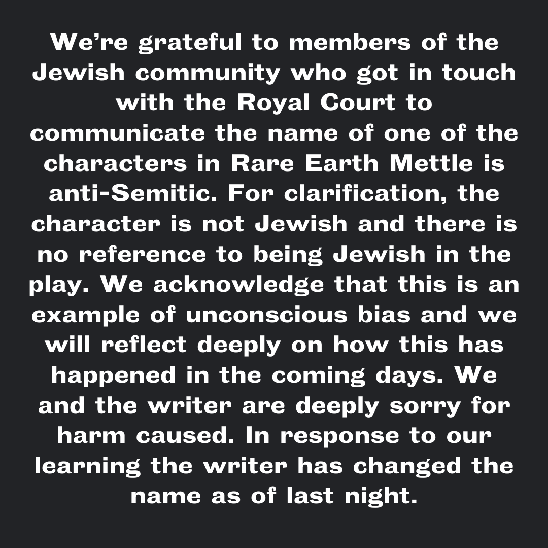 Ahead of opening Rare Earth Mettle to the press tonight, we want to share an update on the antisemitic naming of a character in the play.