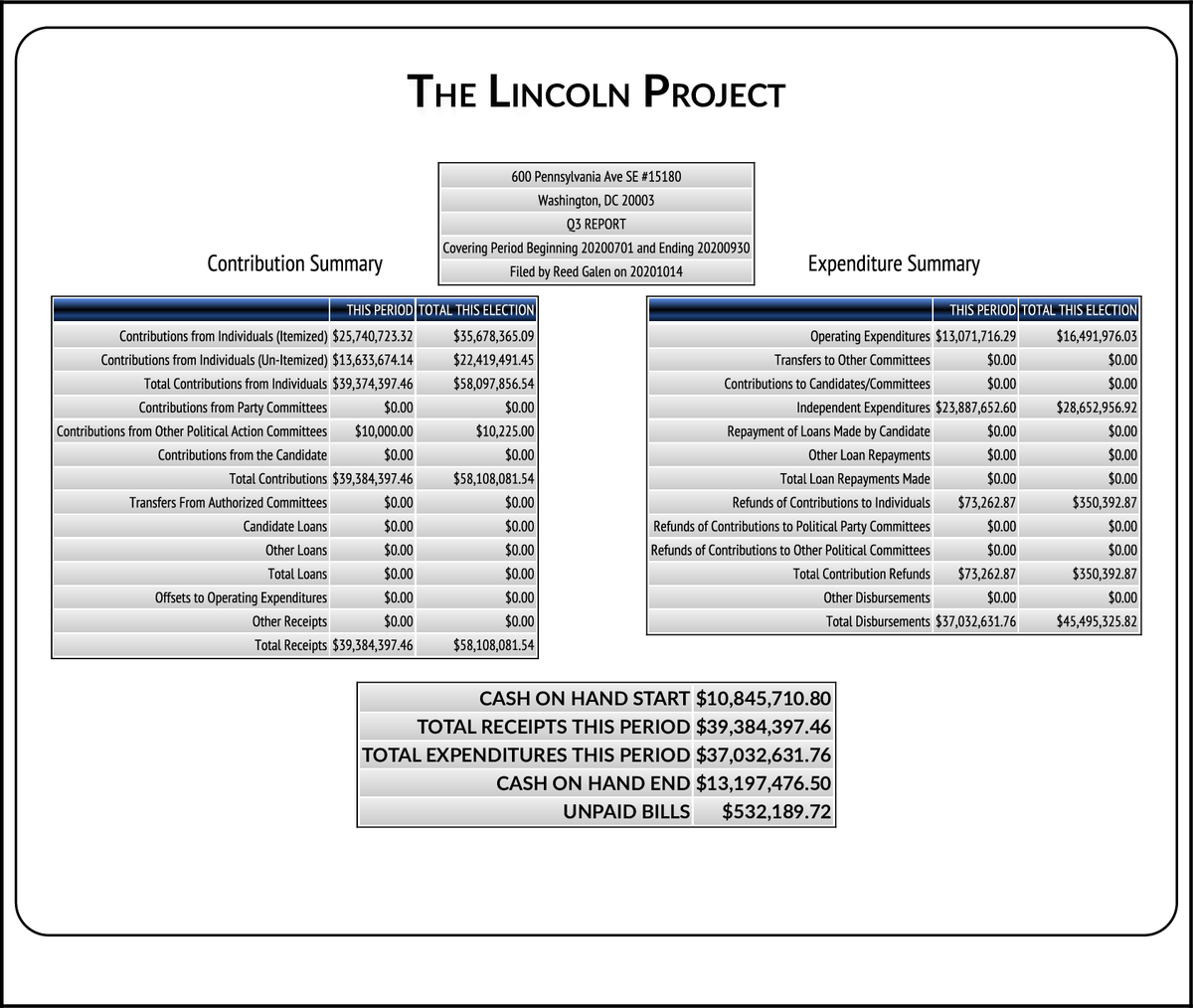 Catering to #Resist donors has been a lucrative reversal of fortune for the Lincoln Project's founders. Reed Galen's Summit Strategic was paid $18.8M in Q3, Ron Steslow's TUSK Digital got $8.7M, Kurt Bardella's Endeavor Strategy got $153Kpic.twitter.com/CgODomvaql