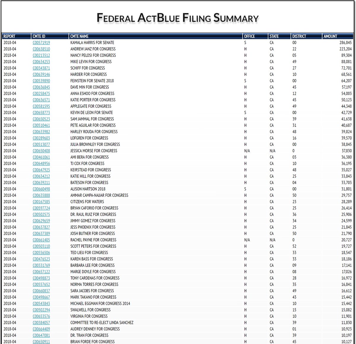 Among California candidates, @KamalaHarris and Devin Nunes #CA22 opponent @JanzforCongress both notched totals of over $200K in April, the only two candidates in California hitting six figures for the month.pic.twitter.com/uZx0OxLbhS