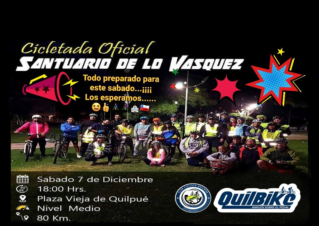 Estamos con todas las energías para realizar este sabado nuestra Cicletada al Santuario de Lo Vasquez, los esperamos a las 18.00 hrs. en la Plaza Vieja de Quilpué, nos vemos...¡¡¡¡