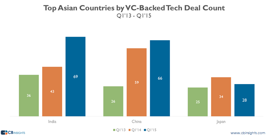 India outpaced China in Q1’15 for VC-backed tech investments, with 69 to China’s 66. http://cbi.vc/1PsCBhD pic.twitter.com/Z2eXowqBjf