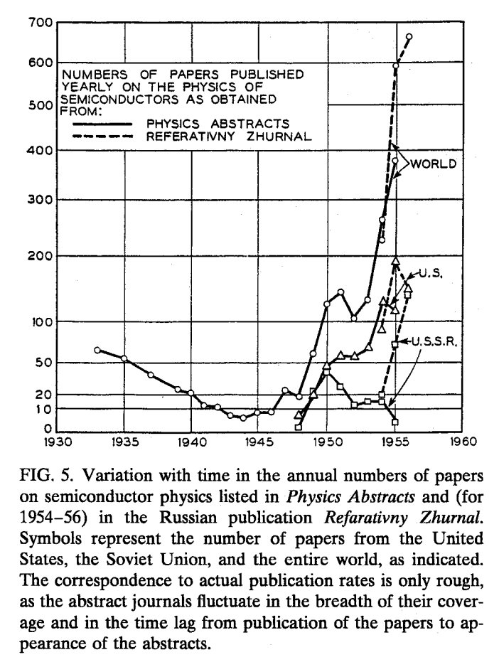 Numbers of papers published on semiconductor physics from 1930s to the 1950s: collapse during the war, then huge spike after 1947 invention of transistor from https://web.stanford.edu/dept/HPS/TimLenoir/SiliconValley99/Transistor/RiordanHoddeson_Inventtransistor.pdf#page=8 …pic.twitter.com/dKzmP3m8DI