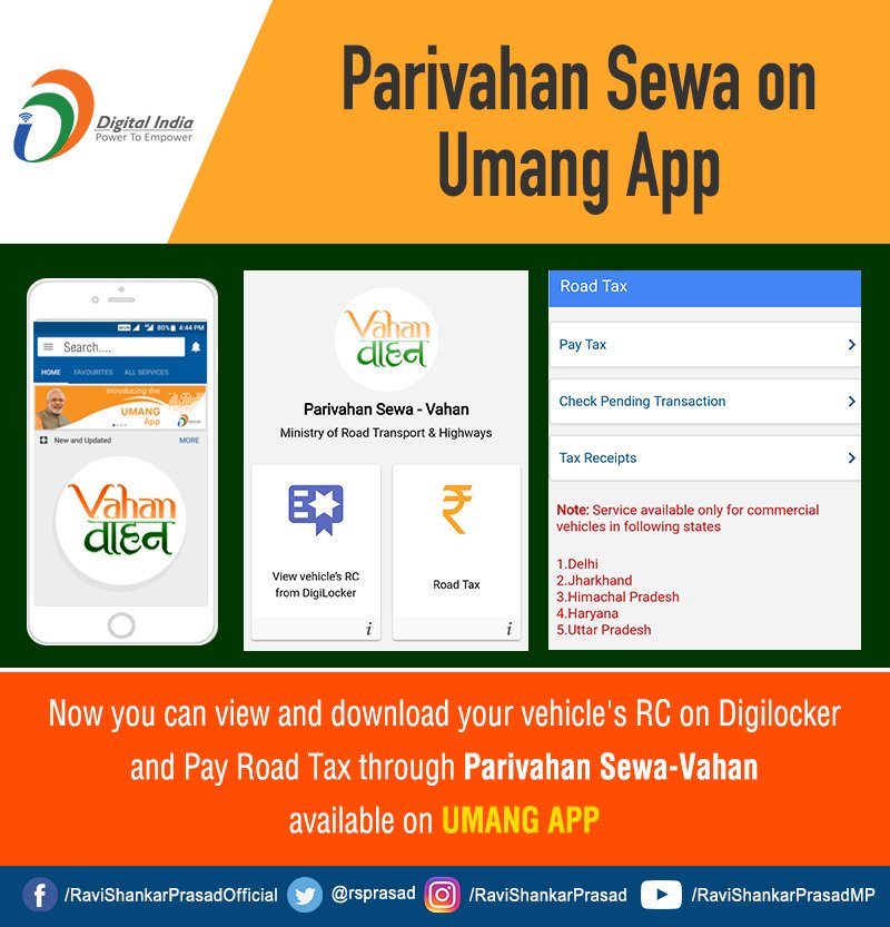Excellent addition of Parivahan Sewa-Vahan in Umang app. This will surely help & benefit citizens to pay road tax and check & download vehicles RC with ease. Thank you Ravi sir &