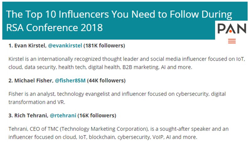 @PANcomm for naming me a Top 3 RSA 2018 Conference Influencer!#rsac#RSAC2018@RSAsecurity@rsaconference#ransomware#cybersecurity#soc#rsa#secops#security#networking#crypto#privacy#hacker#hack#extortion#cyberextortion#breach#pii#darkweb#eu#gpdrpic.twitter.com/VGSMjtbTzV