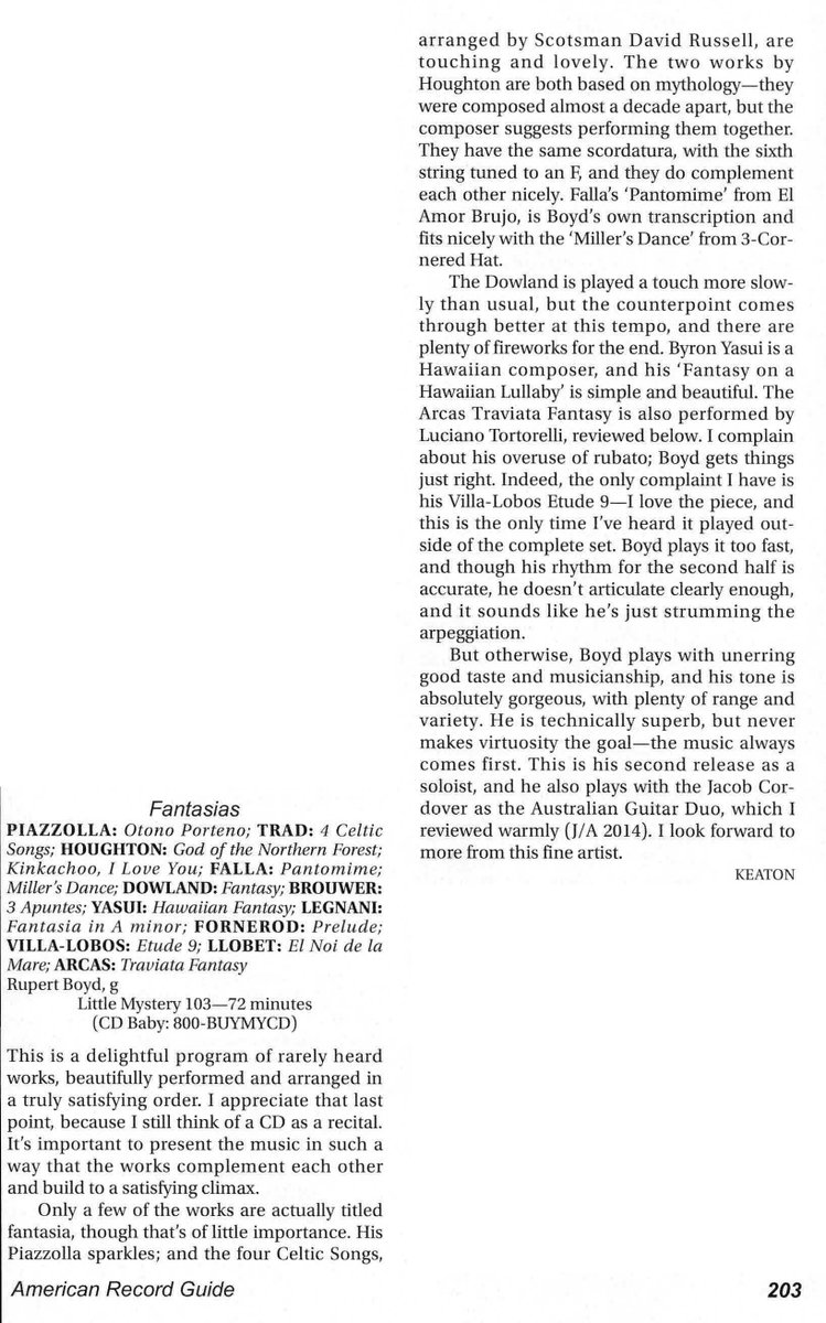 I feel very honoured to have received a rave review of FANTASÍAS in the Sep/Oct Edition of the prestigious AMERICAN RECORD GUIDE!!