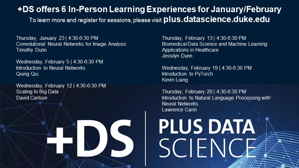 +DS will offer 6 in-person learning experiences in January/February. To learn more and register, please visit: https://plus.datascience.duke.edu/learn-ds#iple