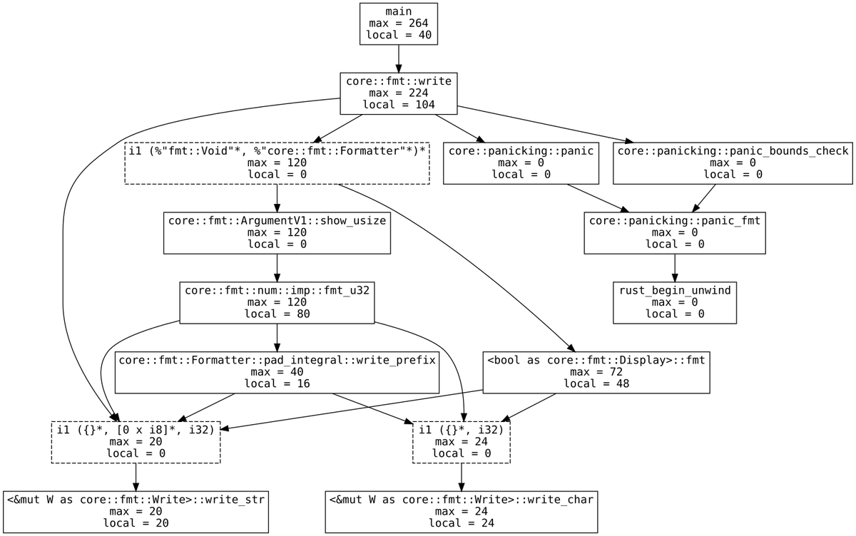 The biggest change is that the user no longer needs linker script magic to preserve the `.stack_sizes` section. Run the tool on "Hello, world" and the graph will contain stack info!