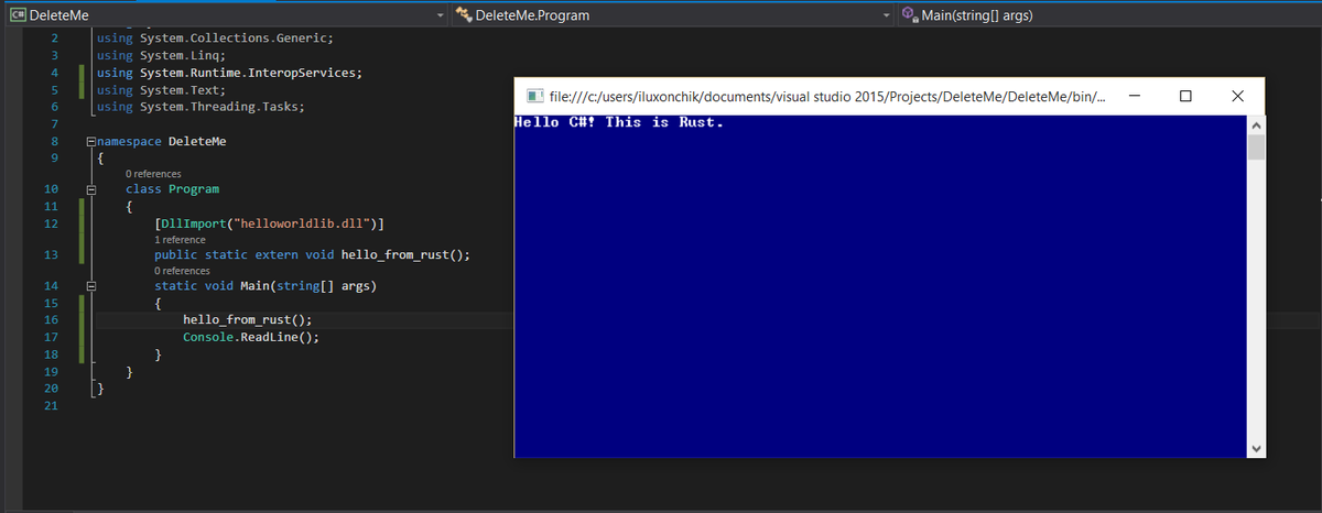 @ILUXONCHIK @rustlang Cool, but where is rust? This just shows how easy calling FFI is in C#, which it is :).