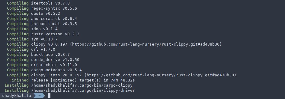 WOW ! I just successfully installed `Clippy` in 1 H and 14 Min , Thanks Cargo @rustlang :'))pic.twitter.com/RaqcxcGPl8