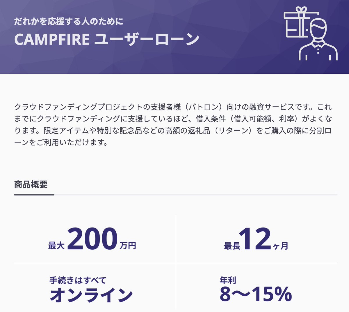 CAMPFIREが過去のクラファン実績を与信とした新しい金融サービスを開始! 支援者数・支援金額を多く集めているほど、借入条件(借入可能額、利率)がよくなる。また支援したことあるユーザーも借り入れできる。 審査・借り入れも2営業日以内というスピード感も良い http://bank.campfire.co.jp/ pic.twitter.com/mi907DiRIa