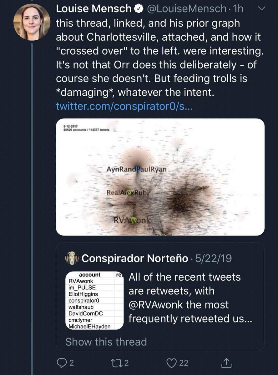 The other thread she’s referring to also has nothing to do with Russia. Or trolls. Not really antifa, either. It’s showing who tweeted about Unite the Right. And yes, I tweeted a hell of a lot about the Nazis marching near my town. My motive? Nazis. In. The. Street.pic.twitter.com/ORFgbOhP4B