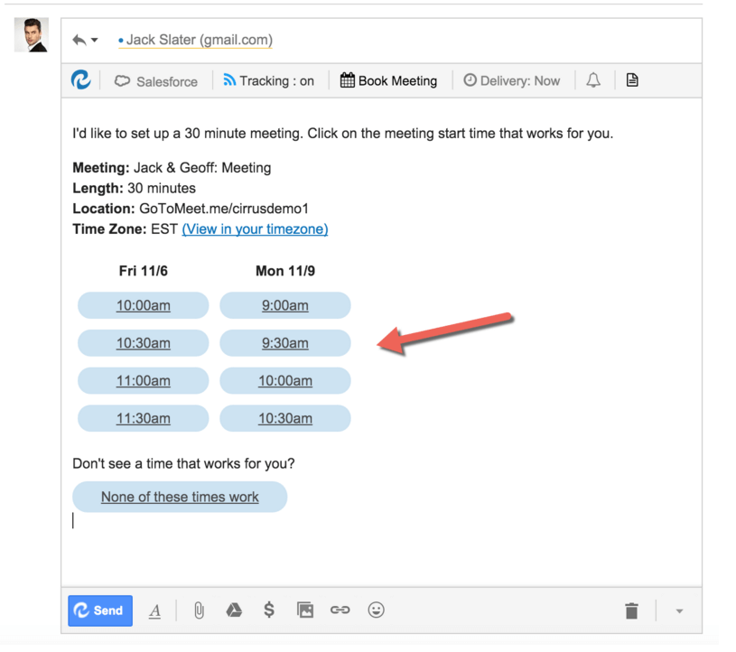 Scheduling meetings is awful. So now you can schedule them in one-click with Cirrus Insight. http://ow.ly/Uz2nE pic.twitter.com/sgfViP0Eo0