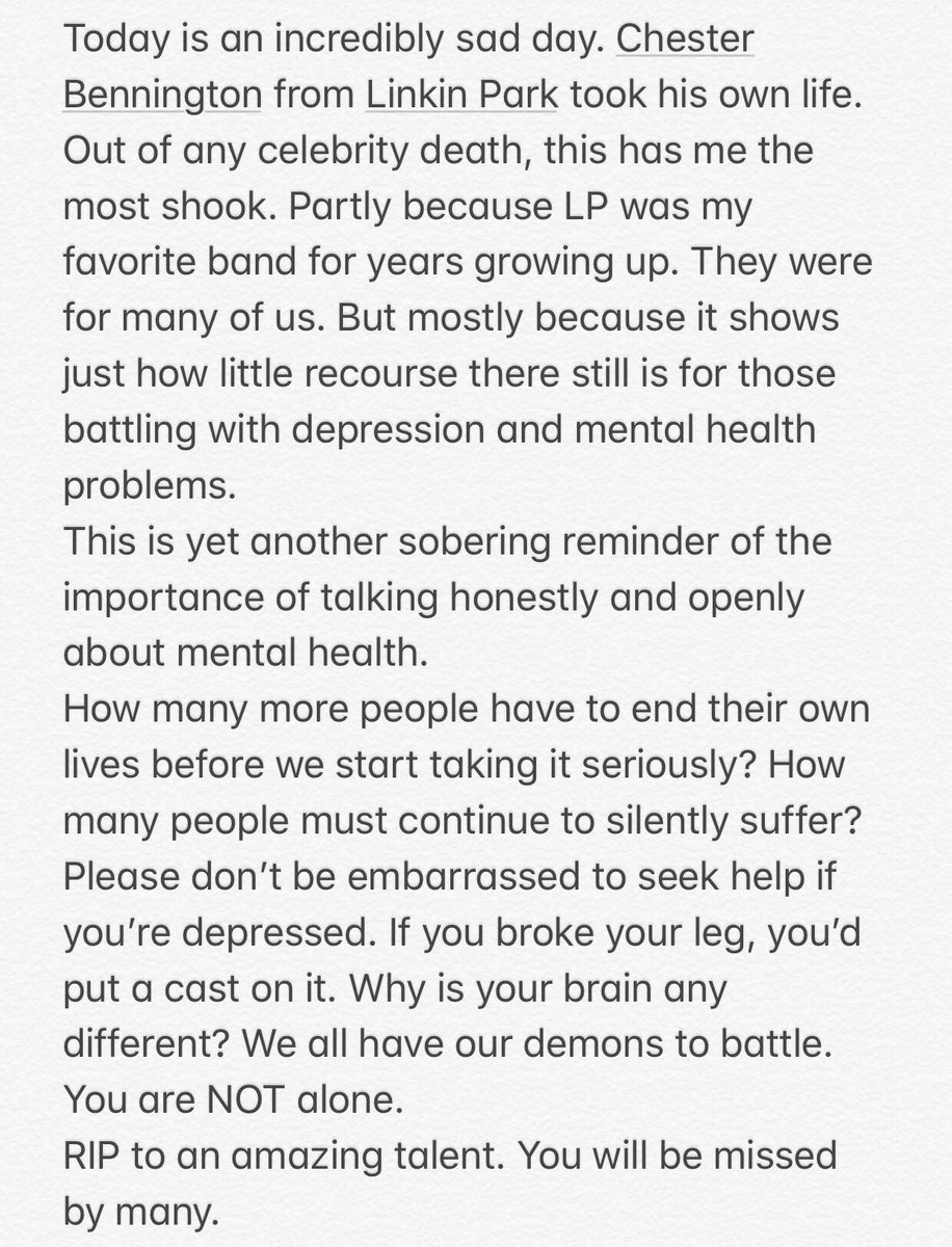A more cohesive summary of my thoughts. RIP Chester Bennington. You will be missed.pic.twitter.com/mNlDRfeNZG
