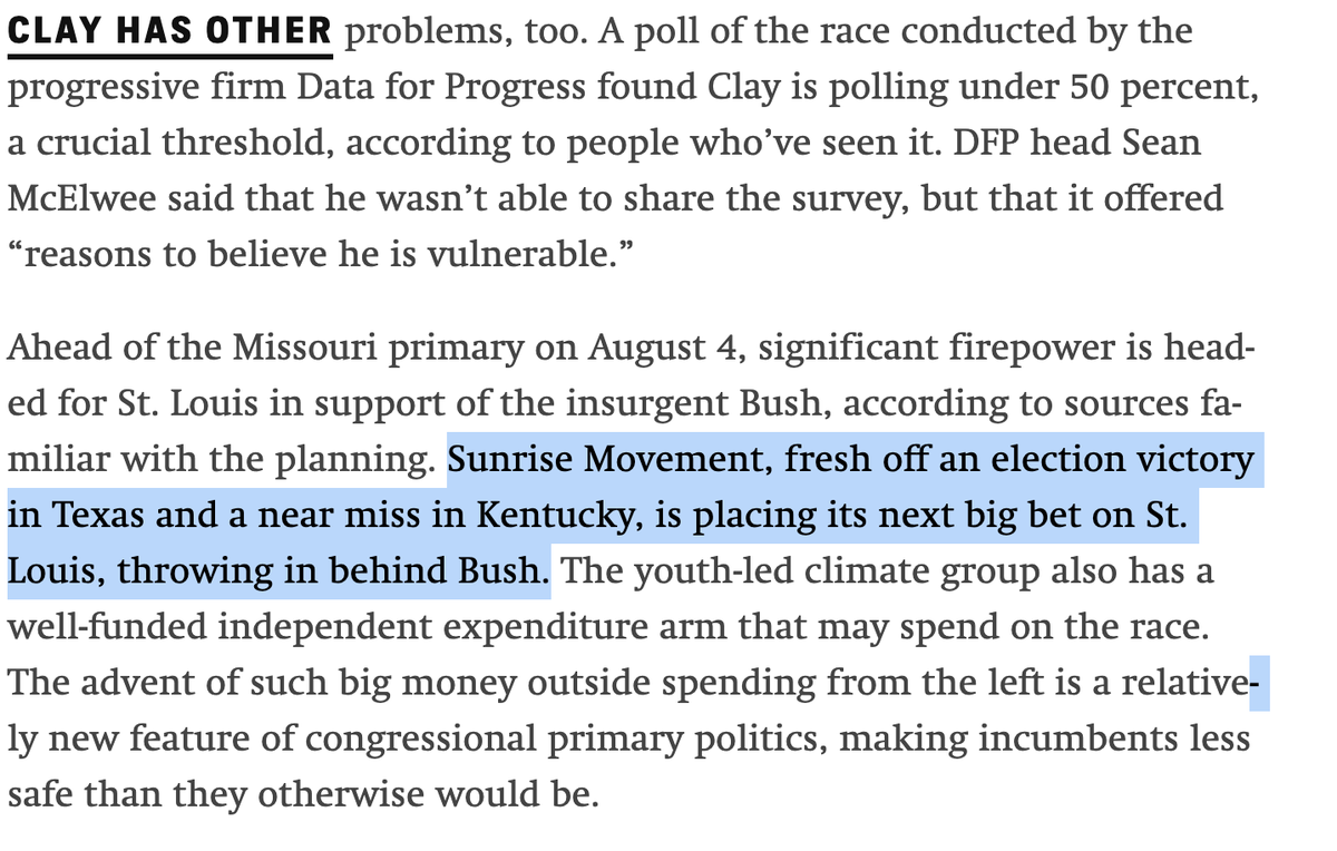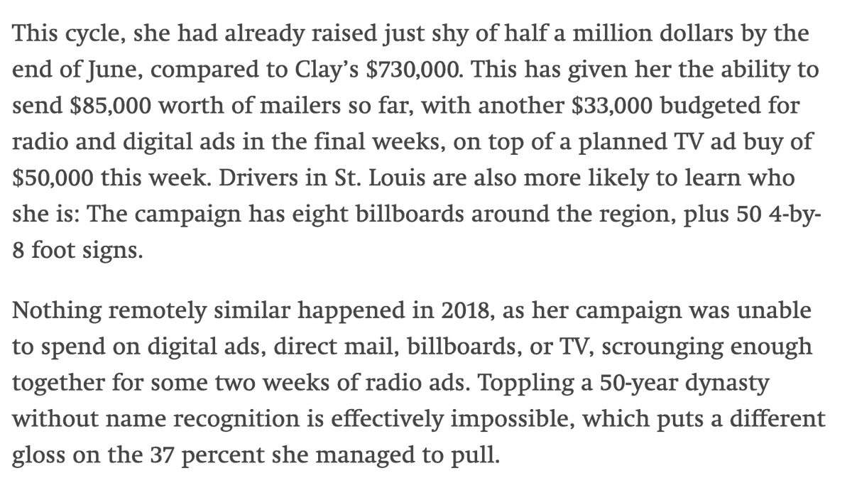 @CoriBush has raised real money this cycle, and will launch her own cable/broadcast ad buy this week, starting at $50k She lost by 20 pts in 2018 but many voters had never heard of her https://theintercept.com/2020/07/20/lacy-clay-cori-bush-wall-street-reform/ …pic.twitter.com/bHOksgoW0Z