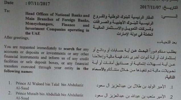 The UAE has sent an alert to banks asking them to search for accounts and assets tied to 16 Saudis rounded up in the purge, according to a copy I obtained. Looks like it's a race to seize their assets.pic.twitter.com/1o8RpZIUR1