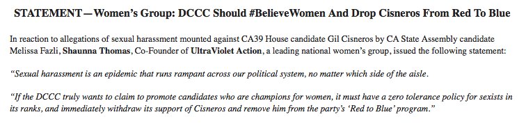 Ultra Violet now calling on the DCCC to withdraw its support from @GilCisnerosCA in the wake of allegations by @MelissaFazli of inappropriate behavior #ca39pic.twitter.com/0MkNfwWpUb
