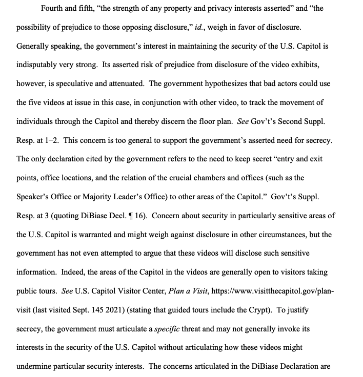 I see I missed quite a bit of Jan. 6 news yesterday (pro-tip: don't get food poisoning). Notably, Chief Judge Howell ordered the release of Capitol surveillance videos in one case, overruling the govt's security objections: https://s3.documentcloud.org/documents/21063267/9-15-21-opinion-eric-torrens-videos.pdf … Prev: https://www.buzzfeednews.com/article/zoetillman/insurrection-capitol-footage-secret …pic.twitter.com/M9EVGDTvV2