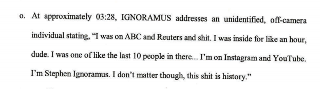 "I was on ABC and Reuters and shit. I was inside for like an hour, dude. I was one of like the last 10 people in there... I'm on Instagram and YouTube. I'm Stephen Ignoramus. I don't matter though, this shit is history.” https://www.justice.gov/file/1362776/download …pic.twitter.com/zi3zgcSRWj