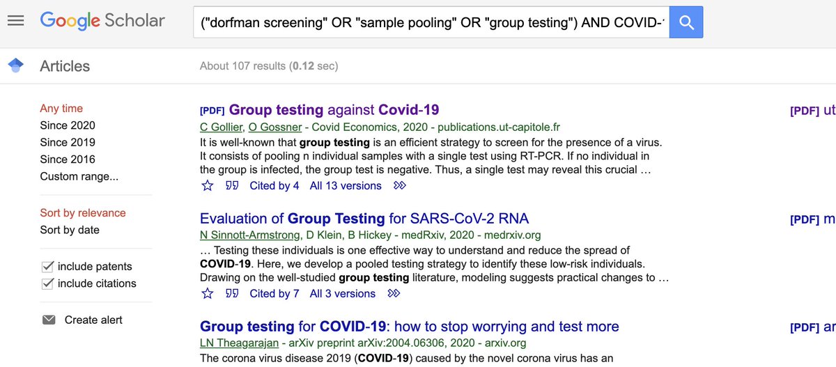 5/ A few more pieces here that are pre-prints on the use of sample pooling for COVID-19... https://www.medrxiv.org/content/10.1101/2020.03.26.20039438v1 … https://www.medrxiv.org/content/10.1101/2020.04.06.20052159v2 … But to dig deeper, you can search through all of Google Scholar with this: https://scholar.google.com/scholar?hl=en&as_sdt=0%2C5&q=%28%22dorfman+screening%22+OR+%22sample+pooling%22+OR+%22group+testing%22%29+AND+COVID-19&btnG= …pic.twitter.com/Auu0Dg70h4