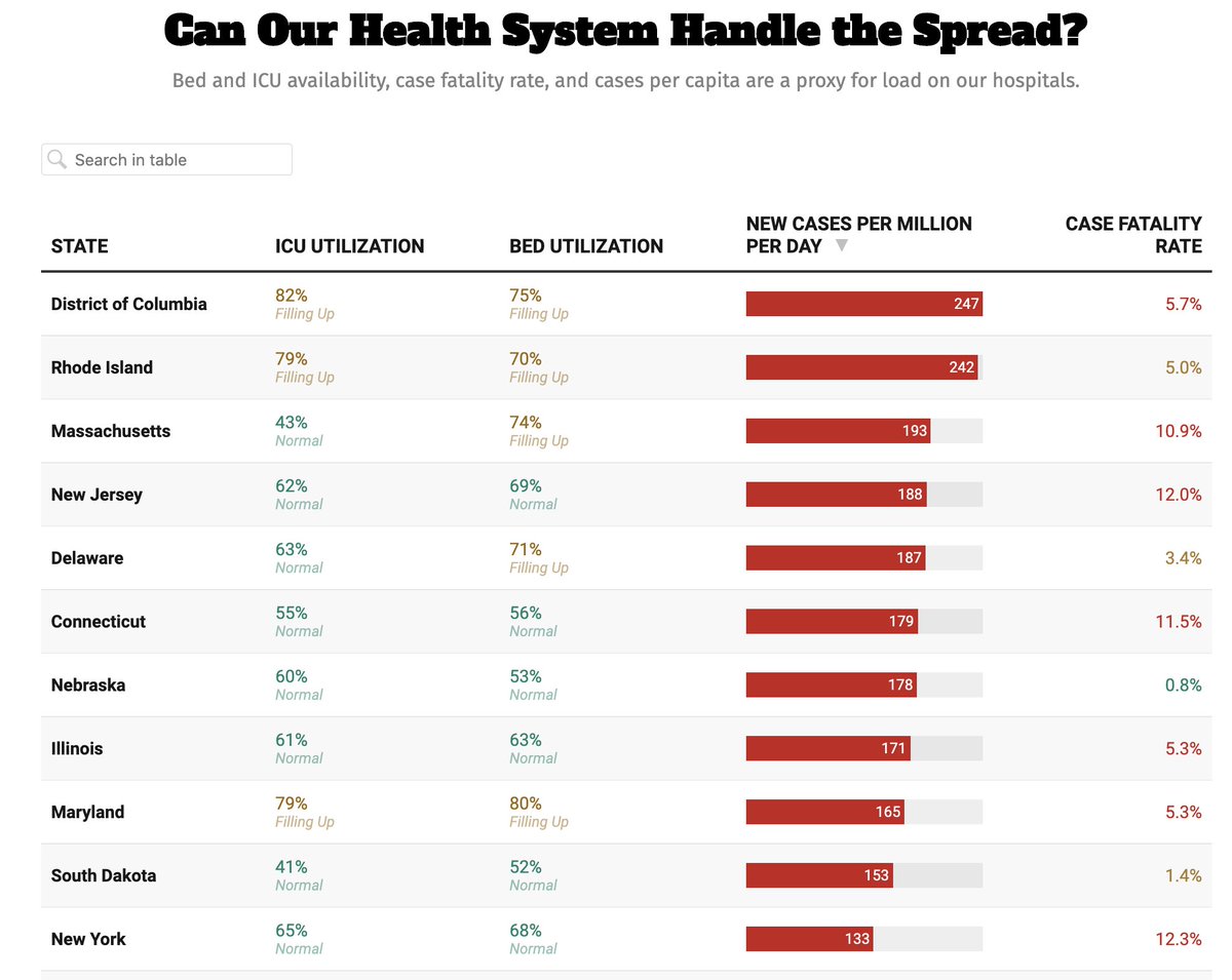 5/ Using publicly available data we try to answer: How is the disease spreading? Can our health system handle the spread? How is my state doing on testing? Unfortunately, we are missing data on how states are deploying contact tracing. A critical part of the