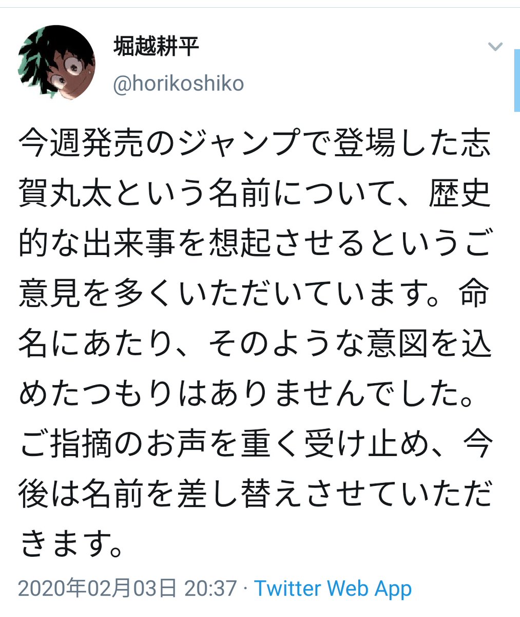 今週発売のジャンプで登場した志賀丸太という名前について、歴史的な出来事を想起させるというご意見を多くいただいています。命名にあたり、そのような意図を込めたつもりはありませんでした。ご指摘のお声を重く受け止め、今後は名前を差し替えさせていただきます。