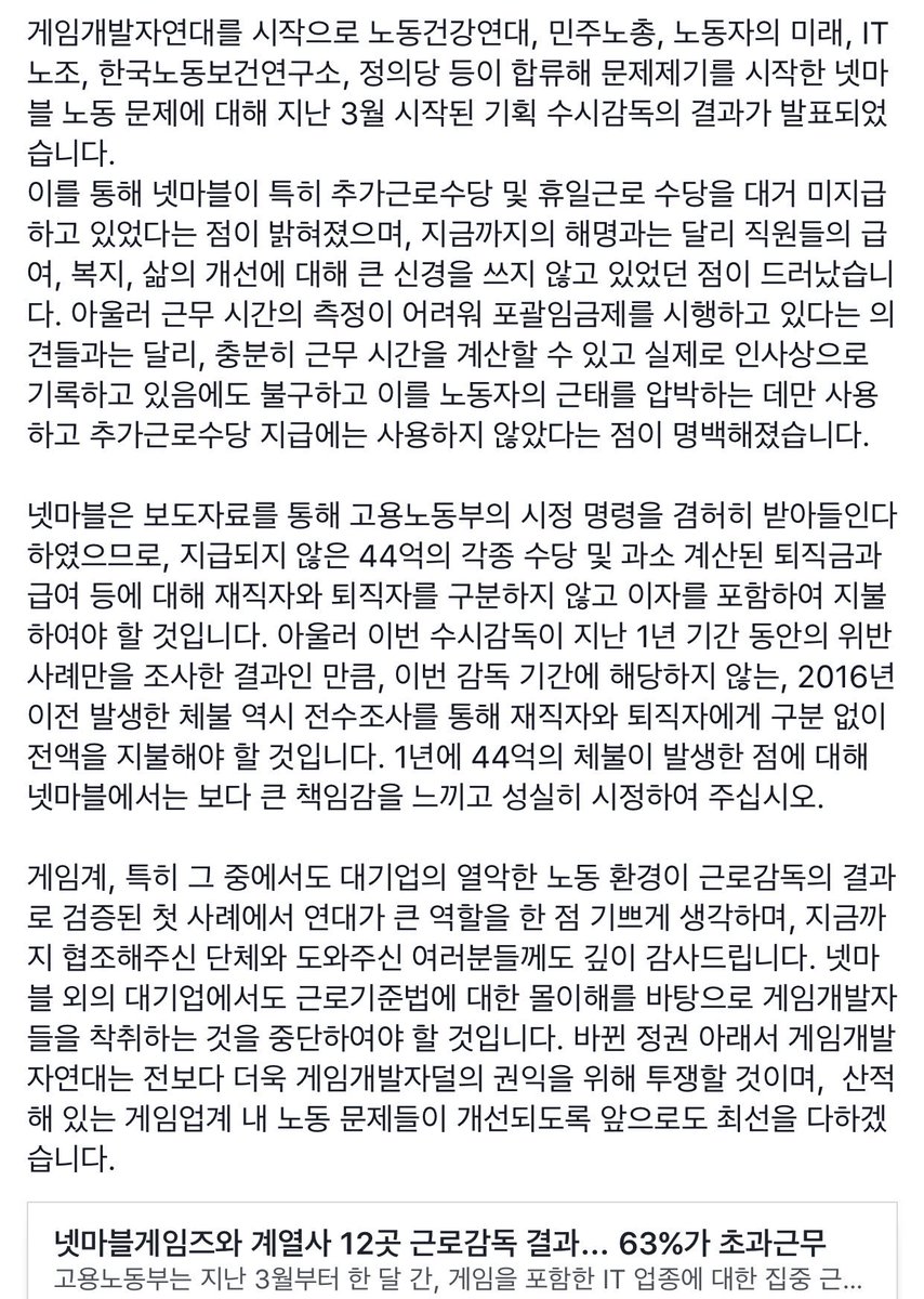 게임개발자연대를 시작으로 노동건강연대, 민주노총, 노동자의 미래, IT 노조, 한국노동보건연구소, 정의당 등이 합류해 문제제기를 시작한 넷마블 노동 문제에 대해 지난 3월 시작된 기획 수시감독의 결과가 발표되었습니다.pic.twitter.com/zlhTEAHHRL
