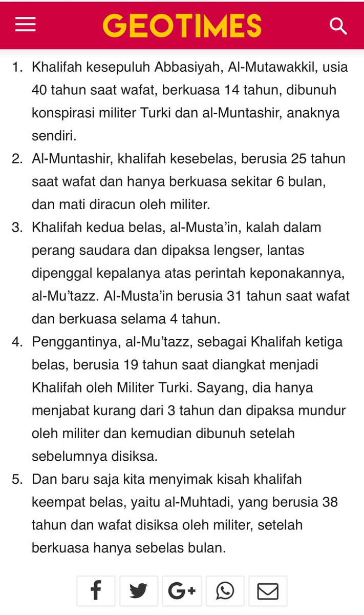 Ringkasan nasib tragis Khalifah ke-10 sampai dengan Khalifah ke-14 Dinasti Abbasiyah. Selengkapnya bisa dibaca di: https://geotimes.co.id/kolom/politik/khalifah-al-muhtadi-umar-bin-abdul-azis-nya-dinasti-abbasiyah/ …pic.twitter.com/iN2k2m3F3D