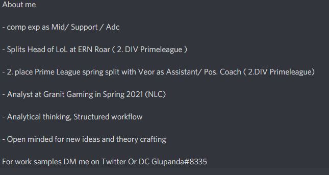Hey, I am LFT as Midlaner! - 2 years competitive experience - huge champion pool - fluent in german and english - german residency - able to shotcall if needed opgg: https://euw.op.gg/summoner/userName=sLiM5h4dY … DMs are open & Retweets appreciated