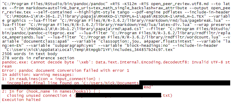Reviewing a paper, trying to reproduce authors' code (hence redaction of filenames). Think I have papaja working but who know with all the package dependencies. Getting this error message. Any ideas? My LaTeX is MiKTeX on Windows, if that helps.
