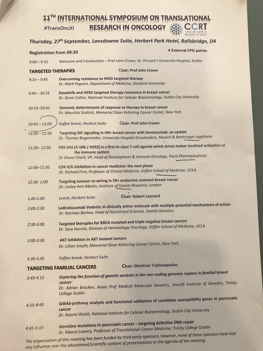@CCRTIreland International Symposium on Translational Research in Oncology, excellent line-up of speakers, cutting edge medical science, great to have such an event hosted in Ireland, many thanks to the speakers & organisers including@ProfJohnCrownpic.twitter.com/t6GSzlrz9C