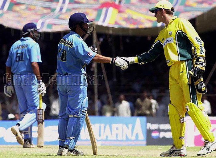 Century No 66: 100 V #Australia, Gwalior 2003 TVS CUP #OnThisDay in 2003 Sachin Tendulkar-VVS Laxman Special Vs #Aus @sachin_rt (100) his 35th ODI Ton @VVSLaxman281(102) Made his 2nd ODI Ton. Runs: 100 (119) 4s:9, 6s:1 Sachin Also Took 1 Wicket. M.O.M- #Sachin IND won by 37 runs pic.twitter.com/LXpZ3YMmiR
