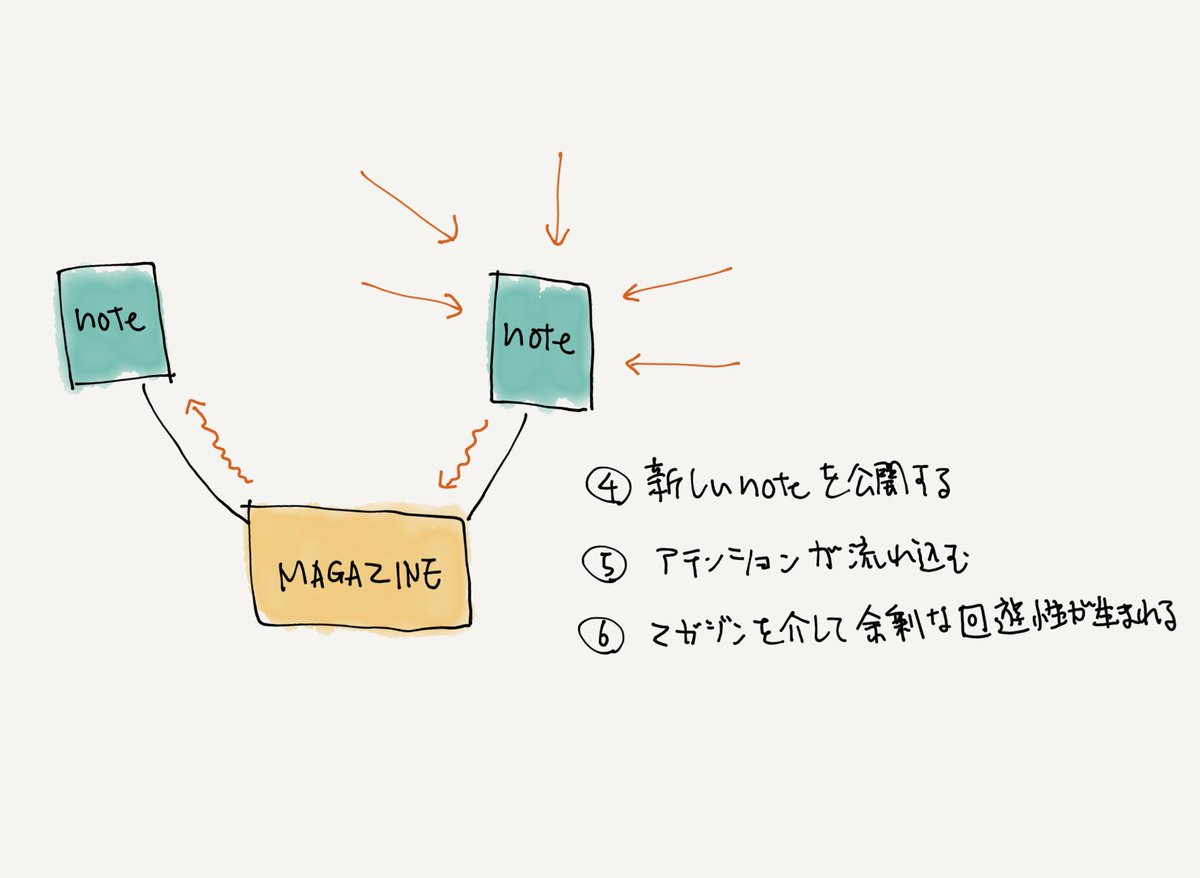 ここを「デスクすっきりマガジン」の様なニッチで嗜好性の高いマガジンで繋ぐとする。 すると④新たなnoteを公開したした際に⑤同様に100のアテンションが流れ込むが⑥マガジンを介して回遊のアテンションが上乗せされる。そしてマガジンがニッチな程、このプラスが大きい(たぶん)pic.twitter.com/sCkM85m3nx