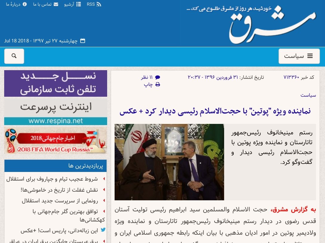 ۲۱فروردین۹۶ دیدار نماینده ویژه پوتین با رئیسی ۲۱تیر۹۷ ولایتی با پوتین دیدار میکند ۲۷تیر۹۷ کیهان: شعار «نه شرقی نه غربی» مال قدیمها بودpic.twitter.com/djQcV6Fc4R