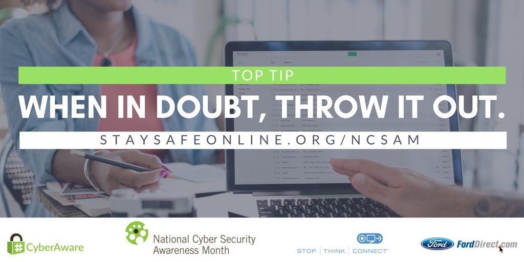 Cyber Security Month tip: In doubt? Throw it out. If an email looks suspicious, delete/mark as spam even if you know the source.