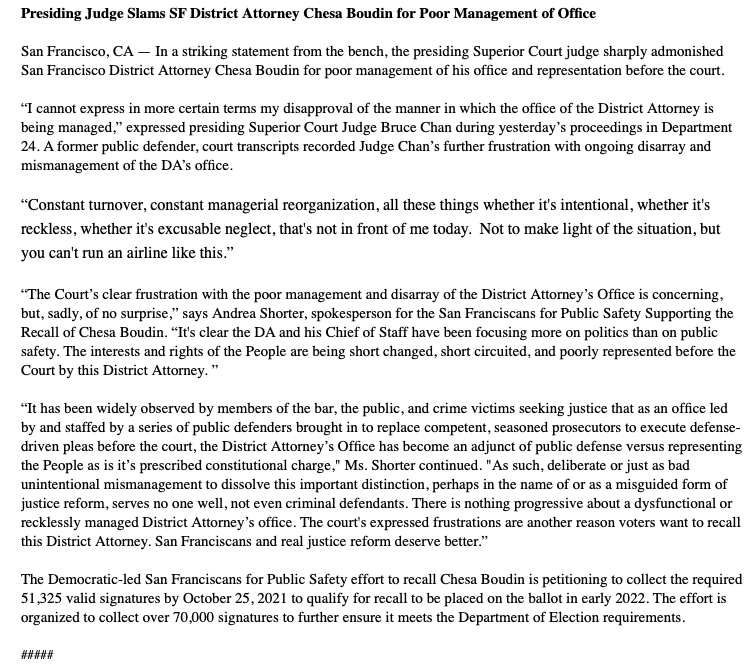 Judge blasts Chesa Boudin for disorganized DA’s office, putting politics ahead of prosecution "Not to make light of the situation, but you can’t run an airline this way" (5/X)https://www.sfexaminer.com/news/judge-blasts-disorganized-chesa-boudin-for-putting-politics-ahead-of-prosecution/ …