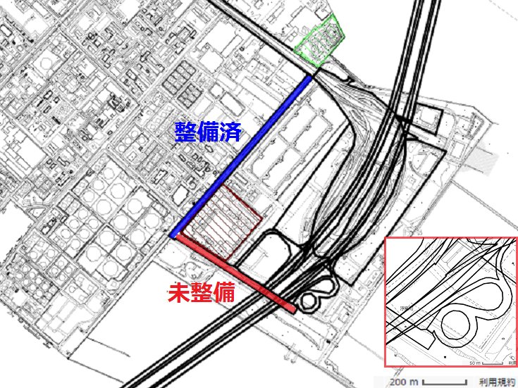 尚、その357号と国道409号&浮島IC間 のアクセス道路(都3・3・15 浮島町線 =完成4車線)は既に大部分が整備済み 但し、開通済区間はほぼ全線、409号方面 側を使った暫定2車線。未開通側は出入口 毎にAバリが並び、まるで障害物競争(笑)pic.twitter.com/PFXTu9NjGl