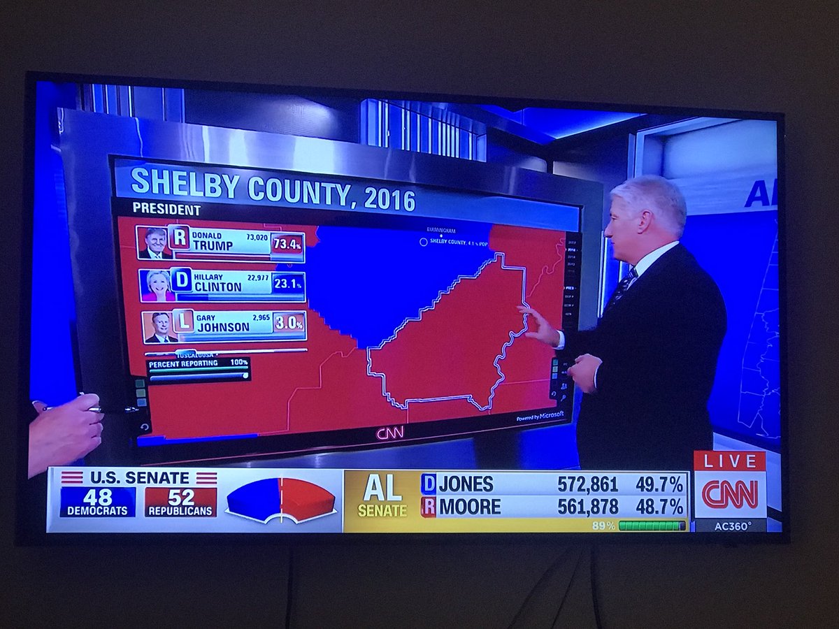 100% of precincts reporting Doug Jones 49.9% Roy Moore 48.4% The Democrat wins by 20,715 votes