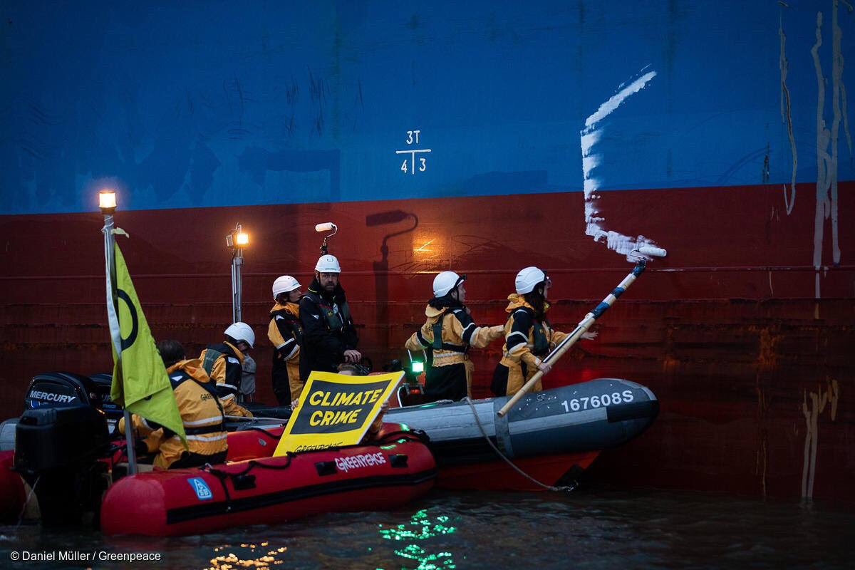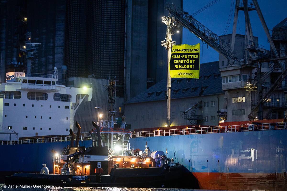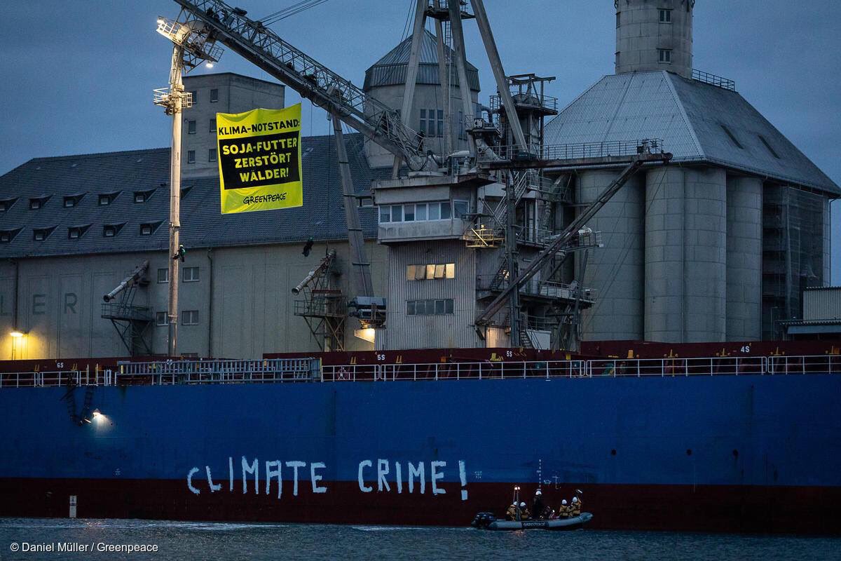 Die massenhafte Nachfrage nach Soja zerstört Wälder in Brasilien! Schluss damit! Greenpeace Aktivist*innen sind wütend und protestieren auf der Weser an einem Futtermittel-Frachter.