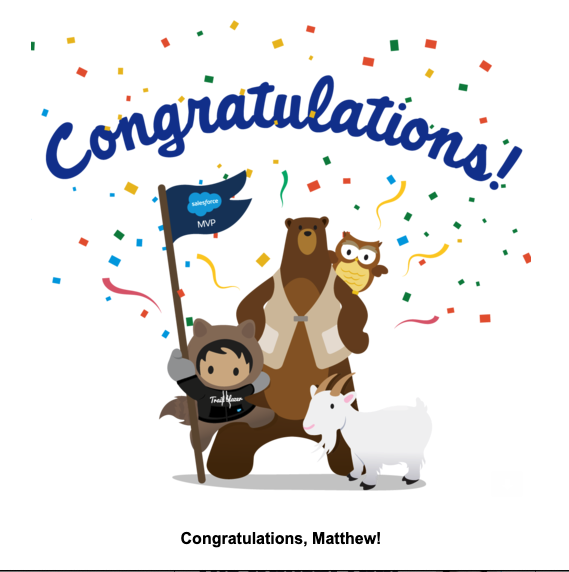 I am over the moon to be named a #SalesforceMVP for a second year. A warm welcome & congrats to all the new MVPs. This is a tremendously generous, smart, cool community, and I feel so lucky to be a part of it. Look forward to forging an even stronger @salesforce community in '20!pic.twitter.com/1XjL80Hsvz