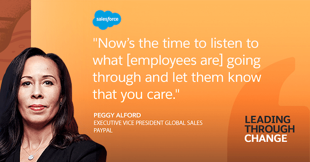Peggy Alford was two weeks into her new role at @Paypal when the World Health Organization declared COVID-19 a pandemic. Her goal was simple: give her team everything they need to help their customers. Peggy shares her experience #LeadingThroughChange: https://sforce.co/39KepZ3 pic.twitter.com/rzaFTJK6ye