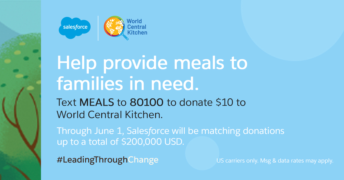 Text MEALS to 80100 to donate $10 to World Central Kitchen or head to https://sforce.co/3aTOGib
